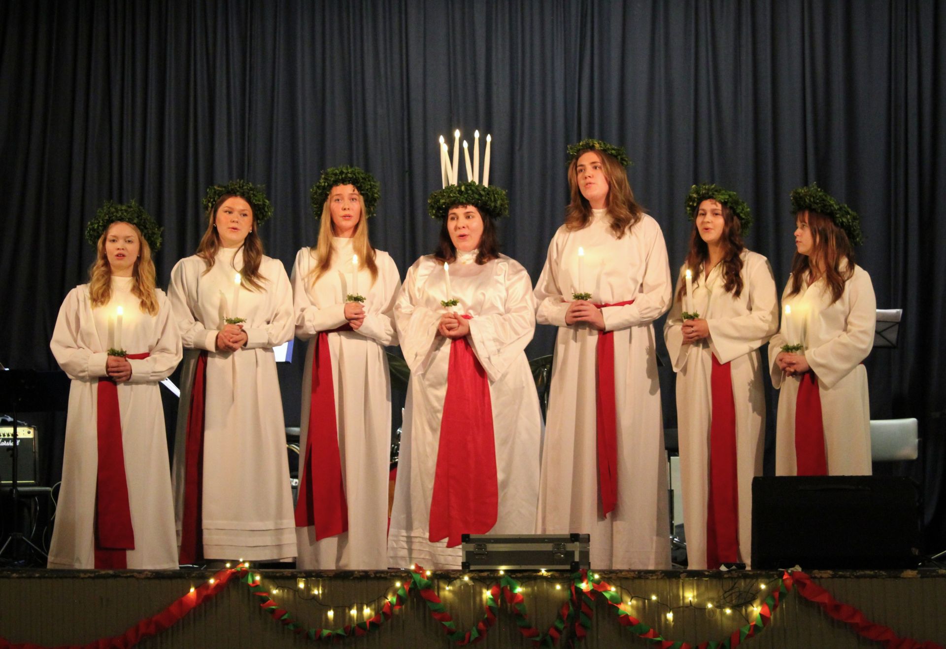Brages Lucia 2024 uppträder på luciafesten. Evelina Lahnakoski var Lucia, tärnorna från vänster Ingrid Finne, Stella Martens, Saga Nyqvist, Emma Bos, Matilda Nykvist och Ida Valkola.